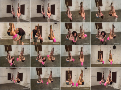 Sandra and AJ are dangling high above floor. They are suspended wrists to ankles, teardrop-style, with their perfectly proportioned posteriors prominently on display in vintage bottom girdles, garters and stockings. They are silenced by matching ballgags. They are also spinning. We get an automatic view of all angles of the two tempting topless tarts, as if they were on display in some Bondage Showroom. Brutish Ben decides that the girls just being completely helpless and silent is not enough and (on-screen) robs them of their sight and hearing by completely mummifying their heads with pink vet wrap. Once done, he applies a particularly aggressive shove to the ladies, sending them spinning counter to each other, scrambling their senses and perceptions.