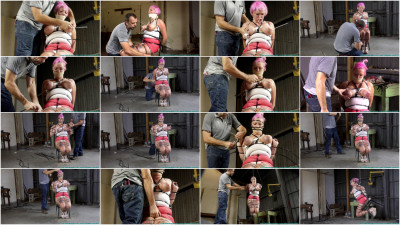 This clip starts where Part 2 ended. I get out more zipties and ziptie her wrists to her upper arms and then her elbows are pulled back and ziptied. More zipties pull her hands back uncomfortably as well. I attach the chain hoist to the back of the chair and suspend Nova. I utilize the rope tied into her hair to tie her head back, before approaching her with a split leather strap. Nova yelps through her gag as I whip her bound big tits unmercifully. I spin her around and step away as I enjoy watching her moan as she spins for our enjoyment.
