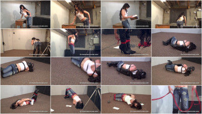 After the sound of breaking glass Kitty enters into a dimly lit room and fumbles for a light switch. The room lights switch on revealing a small movie set at one end of the room and Kitty goes over to investigate. Kitty opens an old school desk and finds various bondage items and an old wooden school ruler and swiftly spanks her bottom with the ruler over her skin tight jean then she pulls down her jeans and spanks her bare bottom – first one cheek and then the other, pausing to feel the growing warmth of her bottom as she increases the power of the strokes until they are visible red and marked. After looking through a bondage magazine and discovering an old diagram for a bondage shoot she decides she will try to tie herself up as the idea and takes out some chain, handcuffs, padlocks, rope and keys from the desk. Kitty padlocks various keys to opposite walls so she will have to struggle from one side of the room to the other to release the keys to release the padlocks that holds the key to her release. Next Kitty ties a crotch rope around herself and more rope around her ankles and knees then padlocks a length of chain to her ankles with the handcuffs padlocked to this chain. Kitty lays on her front and secures her wrists behind her into the handcuffs so she is hogtied and imagines what a real secure hogtie would look and feel like before she proceeds to escape by struggling from one side of the room to the other releasing the keys until she has the key to her handcuffs and releases herself.