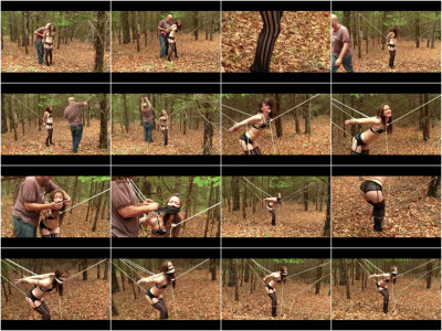 To tell you the truth, who knows what the story is behind this clip. AJ is wearing a black bra and panties with garter belt and black striped stockings. Her black mary jane’s keep picking up leaves as they stick to her heels. She is wearing a breast harness, anchored over her shoulders and her wrists are already tied when the clip begins.