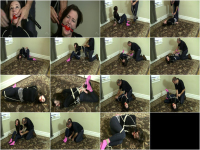 Whatever AJ does to deserve these things? Your guess is good as any. In any case, AJ starts out partially bound, wrists and arms together behind her back. She is facing the camera when a man yanks a ballgag behind her teeth and buckles it down. He flips her onto her back and then ties her knee up against her chest. Once she is in that position, he starts rebinding her arms as she keeps fiddling with the rope.