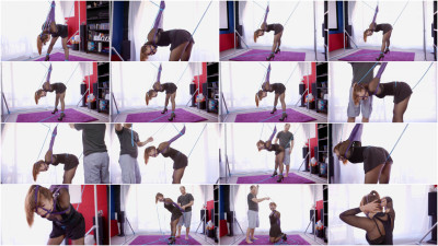 Mina is wearing a sexy sheer hose and skirt combination which is my personal interpretation of what a sexy secretary may be, at least MY sexy secretary anyway It consists of a sheer turtle-neck bodysuit, black bra underneath, sheer pantyhose and a tight velvet thong bodysuit over the top, finished with a sexy mini skirt and black heels. She ‘wears’ a purple lambskin armbinder and harness gag to compliment. She is tied into an interesting strappado position which is rather tough on her back eventually. Ropes in all the right places, her harness gag is tied off to the scaffolding above, her crotch rope is also tied off above, everything pulling at just the right tension. Enjoy.