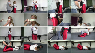 Carissa is dressed in red disco pants a white satin look shirt and black high heeled sandals. She giggles as the tight ledermeister armbinder is pulled up her arms and the yoke for it is strapped on her shoulders. Mr Big Boss laces her arms up pulling them tightly together inside the single sleeve. He rotates her and takes a white cloth stuffing her mouth with it before taking some white microfoam tape and wrapping it tightly around her head sealing the mouth packing in. That step being finished she’s placed into a tight gwen hood and a leather strap is taken and used to strap her arms to her body. The strap is cinched with another strap and her arms are pulled in and together even more tightly. Finally a nice close up of her tightly disco jean clad legs as her ankles are strapped together with another leather strap. Mr Big Boss leaves her to her struggles and Carissa does her best to wiggle around without losing her balance. When he returns he checks the straps to make sure that they are as tight as they could be and then takes her and lays her down on the floor taking a final strap and lacing it into her body straps and looping it around her ankle strap effectively hogtying Carissa tightly in her leather gear. Carissa rolls around the position and endurance of her bondage clearly starting to get to her. Her lovely curves shown off wonderfully as she rolls around displaying the tight red disco jeans from all angles.
