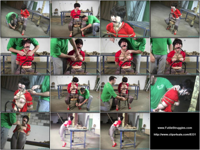 I lead Alison, wearing 6 inch heels and hotpants, into the scene and sit her down in a chair backwards. I quickly tie a rope around her waist and then tie it to the back of the chair (which she is facing). I then quickly tie her ankles to the chair legs. Now that Alison isn’t going anywhere, I can prepare her for whats to come. Of course she needs a gag, so in goes my big spider ring gag to hold her mouth open wide. I let her struggle for a while while I gather more supplies. When I return, I rip open her blouse and knead her tits a bit before I start binding them with thin twine. After they’re both nicely bound, I give them a few squeezes just for fun. I take a few snaphots because she looks so darn good like this. This is where part 1 ends…