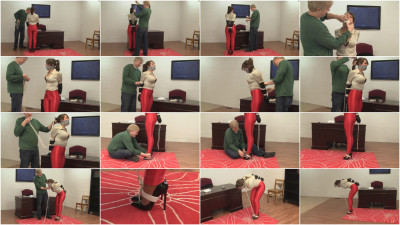Elizabeth has on her tight red disco pants, a shiny blouse and leather gloves. David has her stand up and he quickly binds her wrists together behind her back. With her wrists secured he takes another piece of rope and binds her elbows together equally as tight. Taking two large pieces of mouth packing he grabs Elizabeth and shoves them into her mouth before taking silver tape and sealing the packing in tightly effectively gagging her. Next a body cinch rope tightly attaches her arms to her body and seals off yet more avenue’s of movement to her. Naturally I “check” the rope which really just involves playing with knots while I grab her ass and fondle her a bit. Finally a hair rope is added pulling her head back sharply to her arm ropes. Moving down I grab a rope and bind the arches of her high heels together for a bit of difference in how her legs are tied. One more rope binds her neck off to her arch hobble pulling her into an enforced bent over position. A bit more fondling and rubbing and I’m off to film her in her predicament. Some struggling and motion Elizabeth manages to show off her assets quite well even giving her ass a bit of a shake for the camera. Finally after a bit I tell her that if she can navigate her way off the far side of the carpet i’ll let her out of her situation. She manages to get there after a while which makes for some really nice visuals. With her getting off the carpet she’s fulfilled her part of the deal and I cut to go untie her.