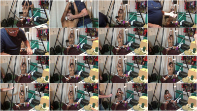 This game and clip was so popular last year that we did it again this year. Poor Drea is tied with her wrists overhead while sitting on a chair. Then each knee is tied out to the sides of the suspension frame so her legs must stay wide open. After that a rope is tied tightly high on the thigh, then ran down to the ankle. Once this is done to each leg, she cannot straighten her legs. After that she is tightly gagged. Then strings are attached to her very handy nipple piercings and those are attached to a bucket hanging in front of her. Enter the crowd. Everyone is told that Drea gets to keep any coins that they throw into the bucket. As the bucket gets heavier, her poor nipples start hurting. So to take her mind off her sore nipples I remove the chair. Since she cant straighten her legs and NO ONE can hang very long by their wrists alone, she is in quite a predicament. Her thighs burn when she take the pressure off of her wrists. Back n forth, back n forth. At least her nipples don’t hurt as much now.