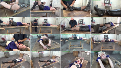 We cuff her hands to the top of the Wheel of Steel, and we also cuff her elbows. Britney is so flexible! Must be all that dancing!