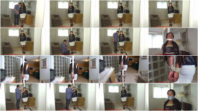 Things have gone from bad to worse for poor Je C! She’s finally been untied from her perch on the porch, so the neighbors can no longer see her bondage humiliation, but now that she has been brought in side, they can’t see how desperately she needs help, either! Bound tightly to a pole and heavily gagged, the ebony beauty can only struggle impotently and “mmmmpppphh” into her packed and sealed mouth as she waits for this game to end!