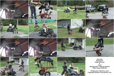 Kali Kane has been busting her ass to get up here for some time, and now here she is, gearing up for her first gig. The saddle fuck caught her eye, and she mentioned she would like to start off with a bang, (or was that a good bonking?) Whatever, she’s definitely hot to trot, and to get down and dirty with the gear. First she lowers herself on to the waiting dildo, then Lydia positions the clit vibrator egg, as Gord completes the restraints that will hold this gal tightly down on to the thrusting dildo.