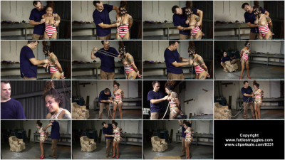 I cut away the lower half of Kingsley’s leotard and use it and clear tape to gag her. I then start intensifying her bondage with more rope. Of course she gets a tight crotchrope, and then I add some rope under her ass cheeks, because I like the way it looks. Her arms are tied as tightly as her flexibility will allow. As more ropes are added, Kingsley seems to be more distressed, and it probably does not help that I scare her, lol. I eventually get her on the floor where I plan to cross ankle hogtie her, but she starts choking on her gag. I remove it, but she taps and that’s it.