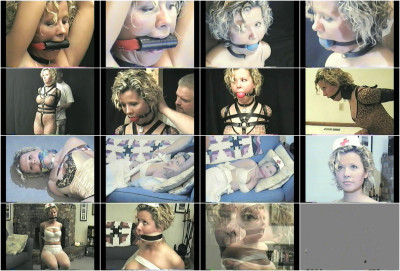 She is bound on a bed in metal shackles, wearing a pig mask.