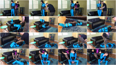 Sexy goth princess Lydia Black submits to a trial in some sensory deprivation. Dressed head to toe in a spandex catsuit, corset and boots.. we strap her all up in a leather armbinder and harness, stuff her mouth with a huge sponge ball and tape it in place, tape over her closed eyes, and then finish it off with a tight spandex hood over the top. Her sexy legs are tightly strapped together, and she is left to struggle in the darkness. She tumbles off the couch and squirms around on the floor. Towards the end of the clip I go to attach a belt and pull the hogtie, and she gives the the signal that she has had enough and needs to be let out.