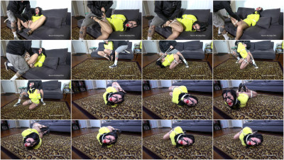 The clip opens up with Nyxon being pushed into the living room by a masked man. Her upper body is tied tightly, and she’s wearing a harness ballgag. The man pushes her down onto the couch & continues to tie her up. He pulls her into his lap & rubs her pussy a bit, then pushes her onto the floor & places her into a tight hogtie. Nyxon struggles around for a bit more, then the masked man lifts up her sweater exposing her big tits. He gropes her for a bit, then leaves her on the floor to struggle.