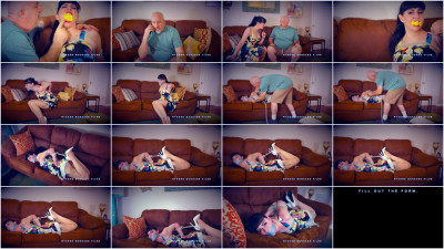 Drug cartel kingpin Jim is waiting for a guy to bring him his shipment, when he hears someone coming up his front walk. He yells, “Come in!”, and a bubbly Nyxon strolls into his living room pulling a large cosmetic case behind her. She boldly sits down & immediately begins to tell Jim about all of the beauty products that she has to sell. Jim tells her she better leave & go to the next house, but Nyxon just keeps on talking. After a few minutes, Jim has clearly has enough, and places his hand over Nyxon’s mouth. She struggles & kicks her legs up, exposing her pink satin panties. Jim tightens his grip, and soon Nyxon falls back onto the couch limp. Some time goes by, and Nyxon’s eyes flutter open. Her arms are pulled behind her back in a chicken wing tie, and her legs are bound tightly together. She struggles a bit & begins to scream, but Jim shoves a yellow rag into her mouth, and wraps duct tape around her head to make sure it doesn’t fall out. He leaves Nyxon to struggle for a few moments, then returns with more rope. He rolls her over onto her stomach, and arches her back into a painful hogtie. Nyxon lets out a yelp, and Jim just chuckles. Whenever his friend arrives, they’re going to have a lot of fun with her.