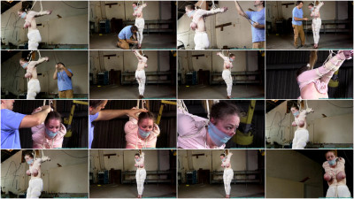 This Clip starts where Part 2 ended… With Pepper in a strappado, I tie a rope to her tits and then pull and tie it off below her knees. The rope I tied in her hair earlier is tied back as well. I clover clamp her nipples as well, but by now her right nipple is . Not being a fan of nipples, I abandon the nipple clamps. I turn her around and smack her ass, then I smack her bound tits for a while as Pepper lets out muffled yelps from behind her effective gag. I step away and order Pepper to turn in a circle for our enjoyment. This way we can see every part of Pepper and her bondage. Since I have decide against the nipple clamps, I compromise and nose hook Pepper instead. I leave her once again to endure her stringent bondage. I added a little bit of behind the scenes footage at the end of the vid.