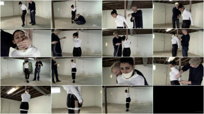 David Sahrye into the basement through the door in her over the knee stiletto boots, disco jeans and tight white sweater. Quickly he grabs some string and her arms behind her back behind the support pole in the basement. Her wrists are quickly secured behind her back and she’s stuck in place on the pole. She tries to reason with him but he just keeps winding the string over and over again. After the wrists are bound he seats himself on the floor and wraps some string around her booted ankles nullifying what could have been her last weapons to defend herself. With that secure he grabs yet another piece of string and goes up to her elbows tying them together and leashing them tightly to the pole further arresting her movement. With that out of the way he comes around and grabs at her tits causing her to twist around and try to desperately and futilely escape his grasp. He’s had enough of her verbal abuse at this point and grabs some packing and stuffs her mouth with it. He produces a roll of microfoam tape and wraps it tightly around her head sealing the packing in and framing her wide scared eyes well as she curses him through the tight and filling gag. More string is then wound around her upper body pinning her even more fully to the pole and continually sealing her fate and adding to her tight bondage. Her ankles are then tied off to the pole and the man moves further up the pole to grab her tits again and listen to her cries of despair against the cruelly stuffed mouth she’s sporting at this point. With that he leaves her to “drain some of the fight out of her” and walks off leaving poor Sahrye to try desperately to free herself before he returns. She can’t manage this unfortunately for her and he returns with another piece of string and winds it around her thighs before binding her waist as well and just continuing to layer her well framed body with string after string. She seems very against the concept of being groped so David gives her one last grope and heads out to leave poor Sahrye to struggle against her tight binds and gag. One last visit enlightens Sahryeto the revelation that he intends to leave her bound to the pole overnight and she starts renewed struggles with the knowledge that she’s expected to endure such tight bondage for such a long period of time. She gag talks and struggles mightily to free herself but sadly can’t budge any of the bondage or gagging.