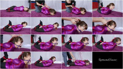Mina is wearing a purple mermaid bodysuit with black tights. She is tightly bound with red rope, gagged and hogtied.
