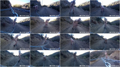 After starting off her morning washing dishes, putting them away and cleaning the counters, a gagged and shackled Greyhound makes her way outside to tackle some more chores.