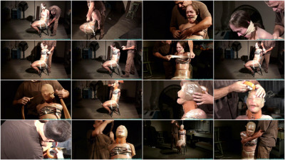This Clip starts where Part 1 ended… More and more tape is wrapped around Rachel mummifying her to the chair. Her current gag is removed and a pair of hose are put over her head. The legs are used as a cleave gag. A posture collar is buckled around her neck, before her head is taped up just like the rest of her. Her chair is hooked to the overhead hoist and she is slowly lifted off the floor. If you thought she was helpless before, well she is beyond helpless now. This is where Part 2 ends.