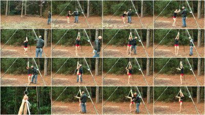 She is pulled beneath a ring and her wrists are pulled up over her head, attached and left there. As she fiddles with the rope, he walks over to a winch and begins pulling her arms up and up, higher and higher, until she is standing on her toes, straining against the upwards pull of her arms. Her naked legs and feet dance on the grass, trying to keep her balance, even as he lifts one leg and ties it off to the ring as well.