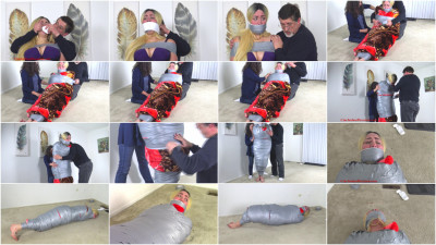Riley Jane is the latest lovely lady to fall victim to the crazy blanket bondage duo, and she definitely gets the worst of it. Her mouth is crammed full with two socks, and you can hear the poor girl gurgle and gag as they are crammed into place, then sealed in place with several winds of grey electrican tape around her head! It only gets worse from there, as more socks are layered over this, each layer also glued to her face with more of the evil tape. Well and truly silenced, she’s rolled up like a burrito in a heavy thick blanket and then cocooned inside with more tape! The poor girl is terrified and furious, fighting like hell to get loose but it’s pointless. She gag talks up a storm, begging for release that’s never going to arrive! Rolling around in her prison, kicking as best she can to try and get herself in any position other than flat on the floor, she definitely tries her best, but fails miserably, mewling and sobbing into her heavily gagged mouth with each defeat!!