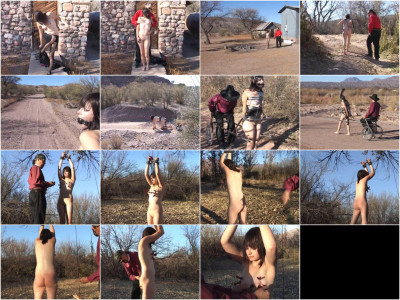 Super cute just eighteen year old Sadie Simone explores her submissiveness outdoors. Stripped naked, she is shackled and ball-gagged, then led barefoot across rocky, dusty desert ranch roads. After a short stay chained to a hitching post, she is fitted with a butt plug ponytail, a bit, and heavy bells on her tender nipples. She then pulls a wagon loaded with firewood while on her hands and knees over the rough terrain.