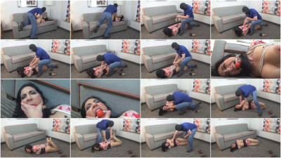 Sexy Raven continuyes to find herself in a situation did not expect. Having answered an ad for new models, and having always wanted to get in to modeling, this sexy brunette found herself in bondage and waiting for a buyer from the overseas sex slave underworld. Wearing a body suit and pantyhose under her skirt, Raven has been tied tightly, ballgagged and placed on the couch. Raven struggles on the couch while being manhandled and tickled by her captor. She is then moved to the floor where she is placed in a tight and inexscapable hogtie. Helpess and defenseless in the strict hogtie, Raven is manhandled more and her ample, luscious breast are fondled, all in the backdrop of her protests and struggle. She is eventually left to struggle in the floor as she waits for her buyer to call.