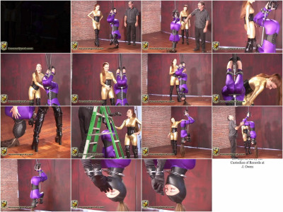 Lydia is back in the first set, in “top” mode and looking dangerous (as usual). Slave 62 is about to experience the Inverted Fiddle device. Not a gadget to find yourself in if you are prone to feeling vulnerable around Lydia. Back at the main studio for the second set, we decided to shoehorn Sasha Monet into a nice tight red suit again and suspend her in mid-air.