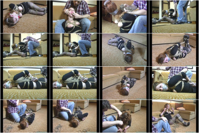 I finish tying and April rolls around on the floor for a bit. I return and manhandle her before pulling her towards me as I sit on the sofa. I remove her harness ball gag and shove a large rag in her mouth instead. I seal it in by wrapping her head with gray tape. I add one more rope in preparation of a hogtie. She struggles for yours and my enjoyment. After a while I hogtie her. I get it as tight as I can, but I can only pull so tight as I have her wrists in her lower back that prevent it. I let her struggle for a while before I return. I roll her on her side. I put one hand over her mouth as I grope and slap her tits. At the end of the clip, I unti her hands and remove her gag. Her reactions as she’s being released are almost as good as when she was being tied.