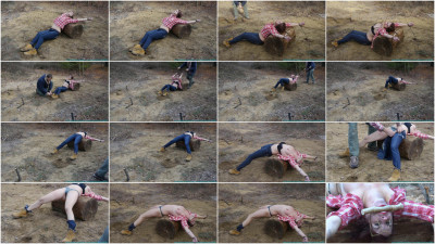 Cherry Doll inherited some land in the middle of nowhere. Out here people work hard all day throughout the summer to prepare for the brutal winters, but not Cherry. Everyone told her that she’d better be prepared, but she didn’t listen. She instead spent the summer swimming in the lakes, reading, and just being lazy. Now it’s getting cold. It’s barely above freezing in the day, but at night it’s getting close to 0. She decides to take the easy route and just go steal some firewood from her neighbor. He has tons of it. Surely he’ll never notice. She is wrong and she is caught red handed. The clip starts with Cherry Doll seated on the ground with her back up against a large log. Her wrists are tied back to long stakes driven deep into the earth. Her ankles are tied to stakes out in front. She is bit gagged with a short length of tree branch. The man she was stealing from enters and makes her bondage a little more restrictive.