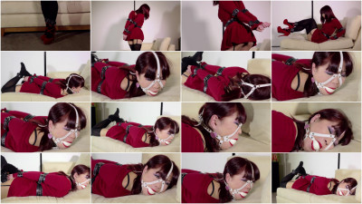 Mina wears a beautiful red dress and a set of cuffs, a few little padlocks can go a long way, eventually she ends up hogtied on the sofa holding the hitachi in just the right place.