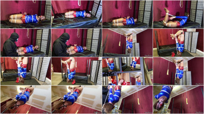 Now in part 2- Ultra Girl is partially untied and hosted over the villains shoulder. She kicks and fights, but without her power belt she is helpless in the ropes. He takes her up the stairs to his dungeon and suspends her by her knees. He clips her belt onto a chain hanging right next to her, leaving her to try to swing over to grab it. He explains he has some more heists to do and is going to leave her there to keep her out of his way. Will Ultra Girl be able to swing over, grab her power belt, and stop him? Or will she dangle there helpless until he returns? Tune in and find out!