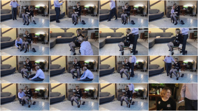 Mike tests Vicky. He ties her to a chair and tickles her.